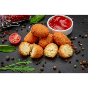 EN | 50% Mozzarella Cheese [Pasteurized Cow Milk, Cheese Culture, Rennet, Table Salt, Preservatives (Potassium Sorbate)], 25.5% Panko [Wheat flour, water, baker’s yeast, edible salt, anti-caking agent (calcium carbonate), antioxidant (ascorbic acid-vegetable source), enzymes (fugal alpha amylase, hemicellulase, lipase)], 20% Minced Beef, Wheat Flour, Corn Starch, Drinking Water, Spice Mixture (Cajun Spice (Red Chili Pepper, Sweet Pepper, Hot Pepper, Salt, Ground Coriander, Ground Garlic, Ground Onion, Thyme, Ground Black Pepper)), Salt.
